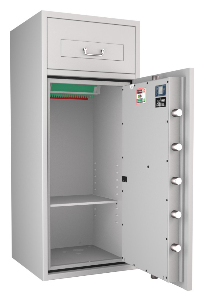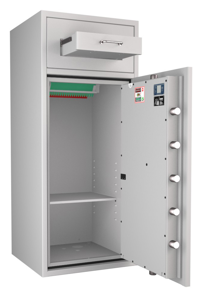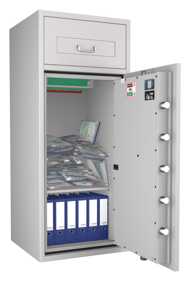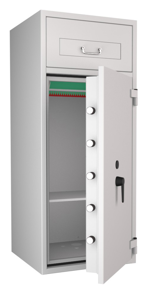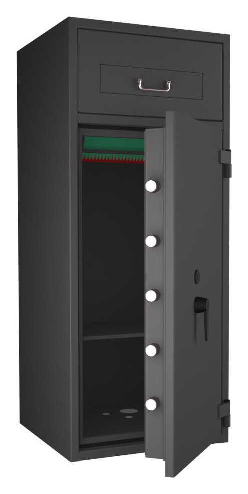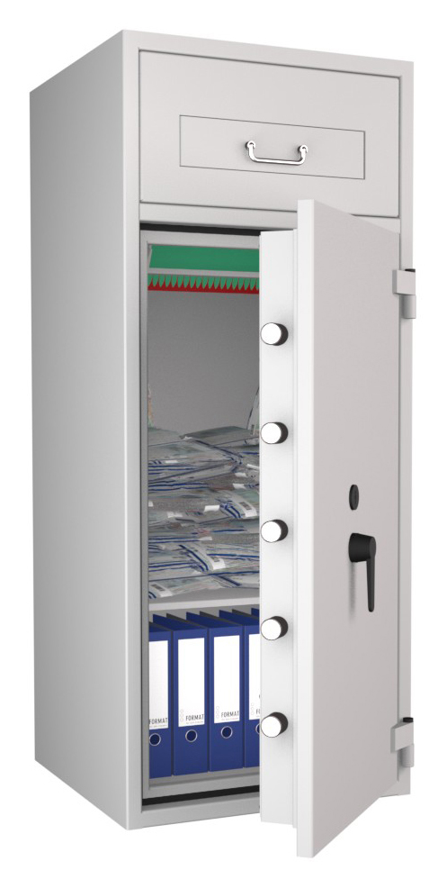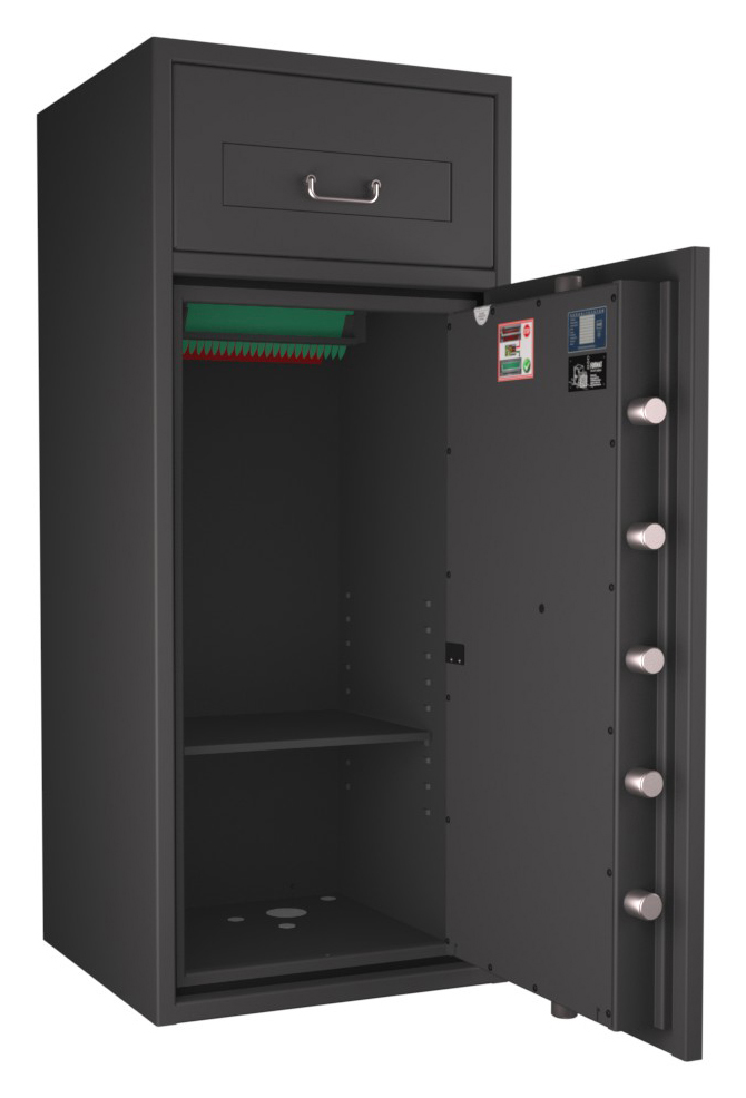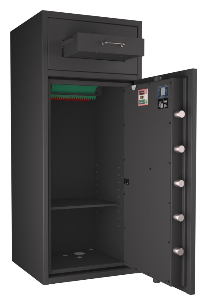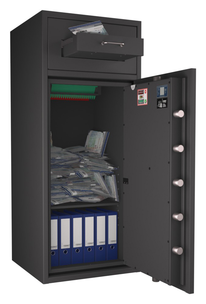 Zertifizierter Depositschrank gem. Widerstandsgrad D-III nach EN 1143-2 für den Einsatz im gewerblichen Bereich. Verschiedene Modellvarianten je nach individuellen Nutzungsbedingungen und räumlichen Gegebenheiten verfügbar.