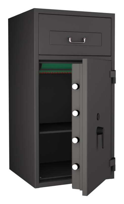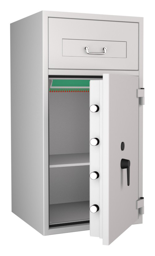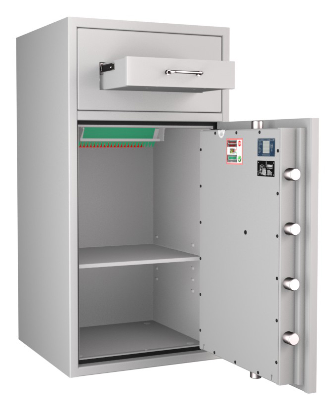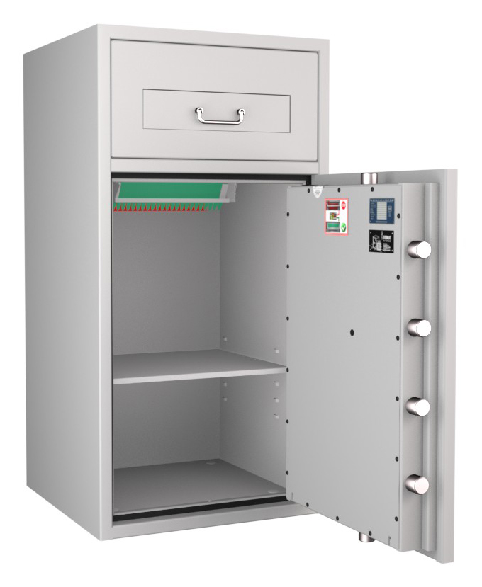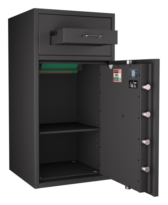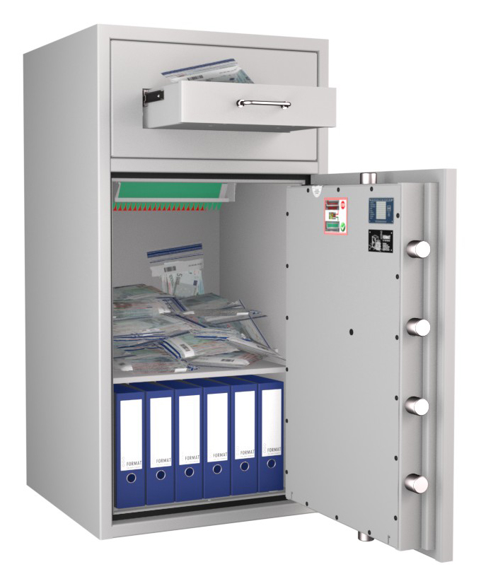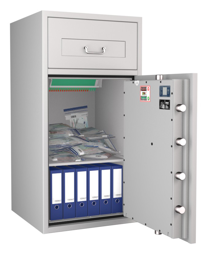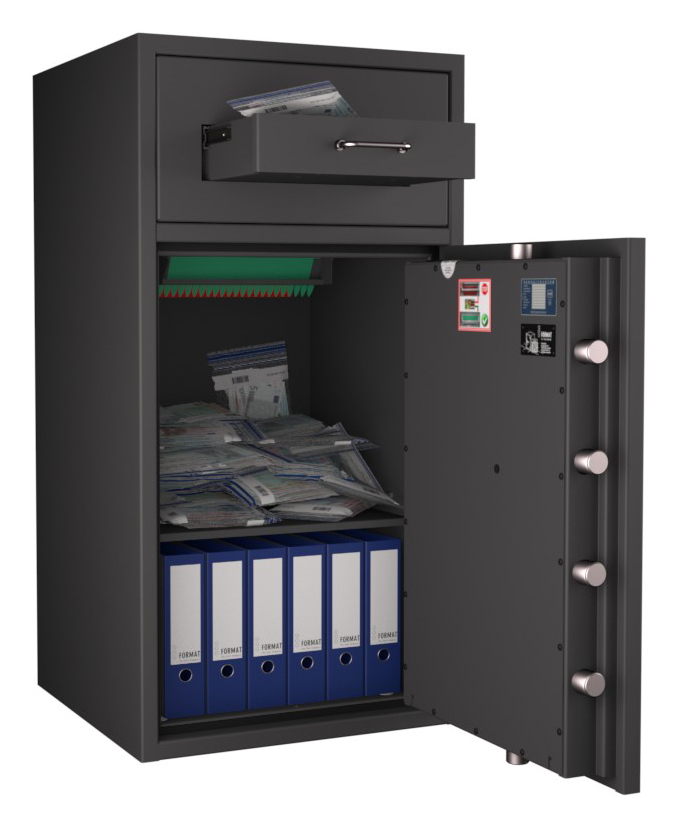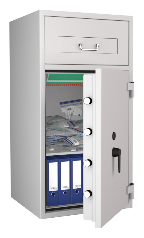 Zertifizierter Depositschrank gem. Widerstandsgrad D-II nach EN 1143-2 für den Einsatz im gewerblichen Bereich. Verschiedene Modellvarianten je nach individuellen Nutzungsbedingungen und räumlichen Gegebenheiten verfügbar.