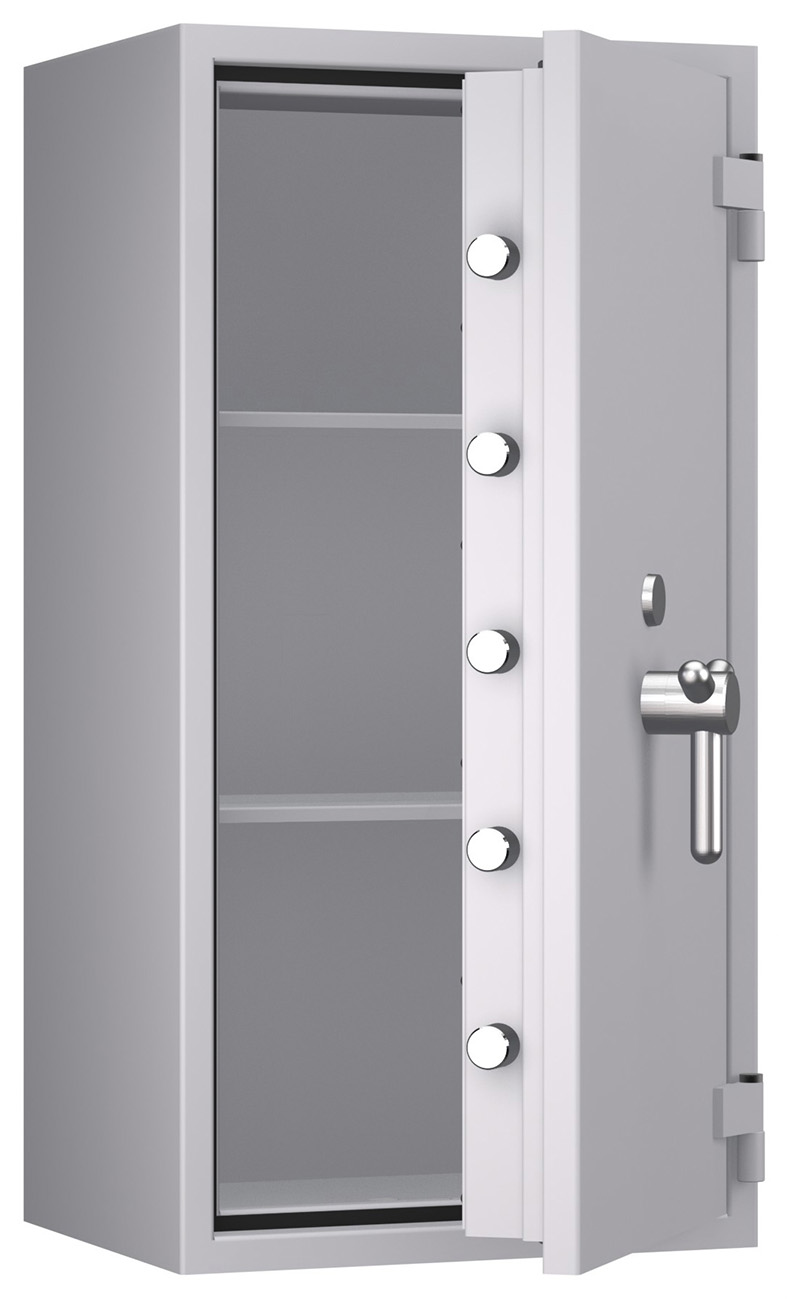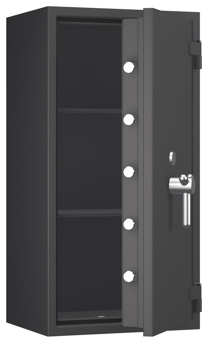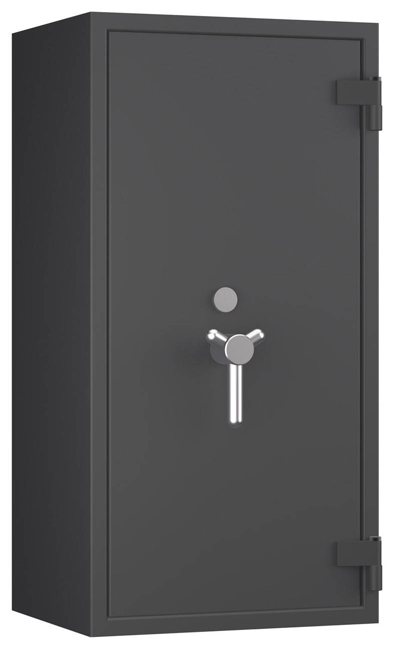 Zertifizierter Wertschutzschrank gem. Widerstandsgrad II nach EN 1143-1 mit Einbruchschutz und optional erhältlicher Brandschutz-Ausstattung. Vielseitige Einrichtungsoptionen, individuelle Schlossauswahl, gewichtsoptimierte Bauweise und ein großes Innenvolumen sind die Vorteile dieser Tresorserie.